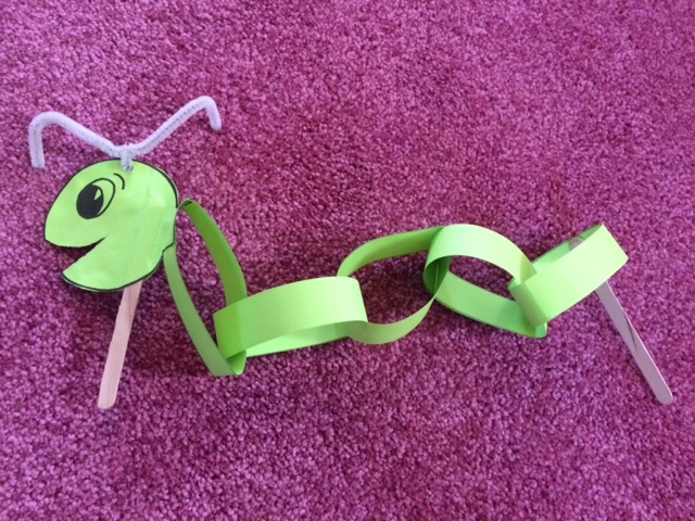 Then, when everyone is ready, we will set up tables and get ready for our first workshop. At this writing (April 23), we plan to have kids make a paper caterpillar puppet. This performance and make-and-take are aimed at our younger audience members, but the show is for all ages and older kids will enjoy this project and are free to ad lib.
